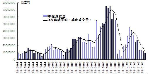 圖1. 1996-2012年全球新船訂單季度成交量走勢(shì)