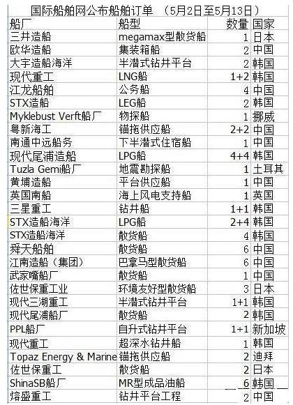 根據(jù)國際船舶網(wǎng)公布的5月2日至5月13日的船舶訂單來看,鉆井船和液化船高端領(lǐng)域的表現(xiàn)異常搶眼;中日韓仍然是世界上訂單最為活躍的三個(gè)國家。其中,韓國在高端造船上顯示出“誰與爭(zhēng)鋒”的氣勢(shì),中國在高端領(lǐng)域亦有所收獲,但仍然以傳統(tǒng)造船為主,日本已經(jīng)走環(huán)保路線。