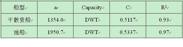此基線公式由丹麥根據(jù)LR的Fairpiay中的數(shù)據(jù),結(jié)合當(dāng)時初步EEDI計算方式,通過一定假設(shè)以Capacity為自變量,采用指數(shù)函數(shù)的形式向IMO組織提出。通過對現(xiàn)有船型的回歸分析,得出其相應(yīng)的a和c的數(shù)值。