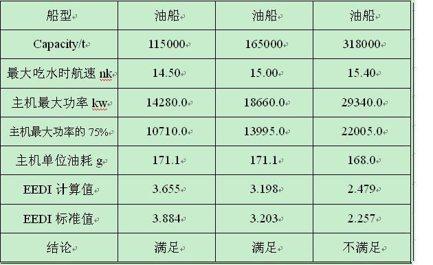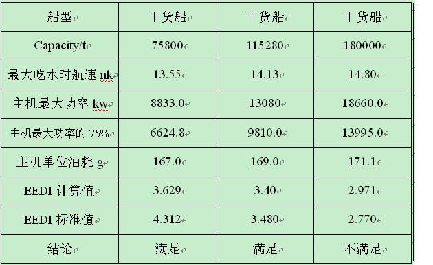 按EEDI的計算公式,對常規(guī)的三艘散貨船(75800t、115280t、180000t)進(jìn)行計算結(jié)果DWT75800t散貨船符合要求有余度;DWT115280t散貨船符合要求無余度;DWT180000t散貨船不滿足要求(詳見附表1)。