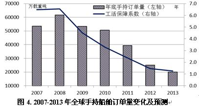2013年度手持訂單量預(yù)測(cè)。按照上述預(yù)測(cè),根據(jù)大致測(cè)算公司“期末手持訂單量=期初手持訂單量-期間造船完工量+期間新船訂單量-期間訂單撤銷(xiāo)量”,預(yù)計(jì)2012年底全球手持船舶訂單量降至2.5億載重噸,2013年可能進(jìn)一步跌破2億載重噸。全球造船業(yè)工活保障系數(shù)由2007年6.6年將跌至2012年底1.6年,2013年進(jìn)一步下滑至1.25年(以1.6億載重噸有效產(chǎn)能測(cè)算),預(yù)計(jì)2013年全球?qū)⒂懈嗟拇瑥S(chǎng)面臨無(wú)船開(kāi)工的局面。