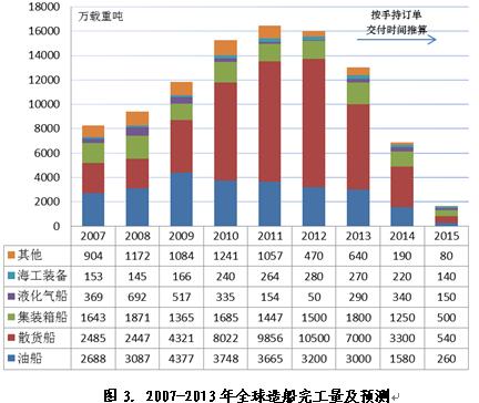 2013年度造船完工量預(yù)測(cè)。按手持訂單量交付和后續(xù)訂單交付期安排,同時(shí)考慮近幾年訂單未交付情況,預(yù)計(jì)2013年約為1.3億載重噸,較上一年下滑15%左右,2014年和2015年將進(jìn)一步下滑。2013年全球造船產(chǎn)能有效利用率加速下降基本上已成定局。