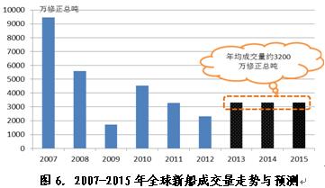 從新船需求來(lái)看,近幾年老舊船舶拆解強(qiáng)度顯著加大對(duì)“十二五”后三年行情會(huì)有很大促進(jìn)作用,預(yù)計(jì)2013-2015年期間年均需求預(yù)計(jì)約為3200萬(wàn)修正總噸,其中,2013年成交量約為2960萬(wàn)修正總噸,2014-2015年成交量有望進(jìn)一步放大到3500萬(wàn)修正總噸左右。